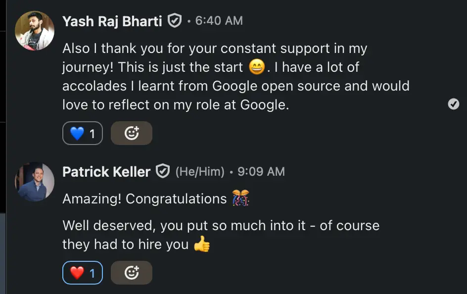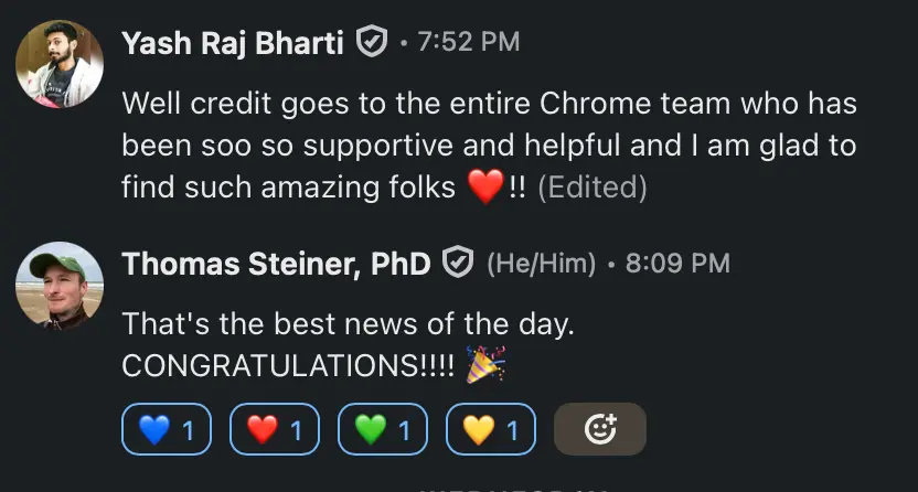 I am building two great explainers with design and code solutions alongside the Chrome team, the auto-captions and cross origin storage (COS), not only that I am involved in testing them for people with disabilities. This is where appreciation from Dirk Ginader (Google a11y lead) makes me feel so proud.