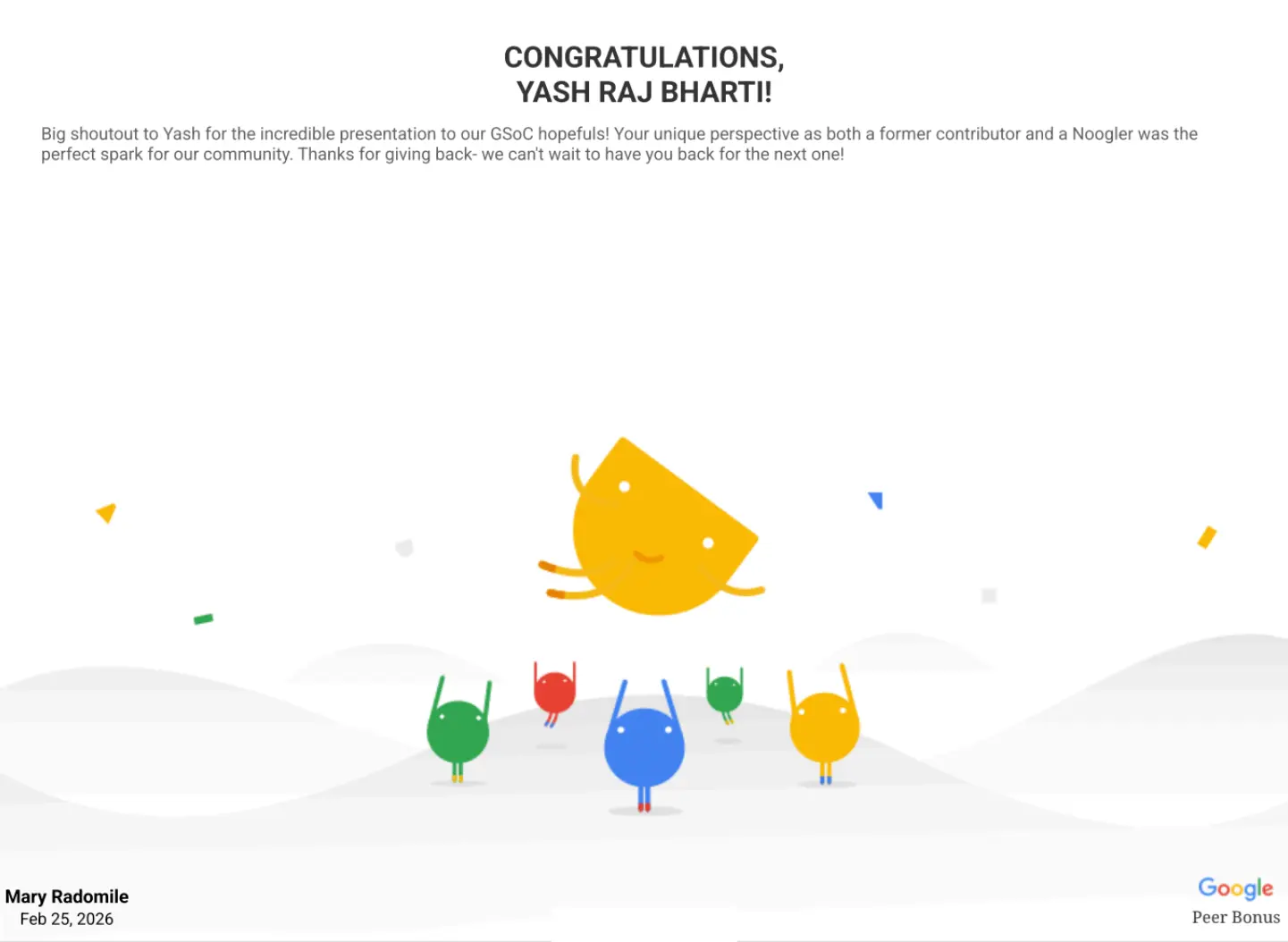Peer bonus from Mary at Google!